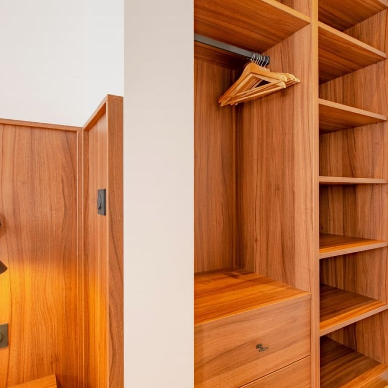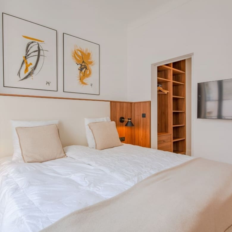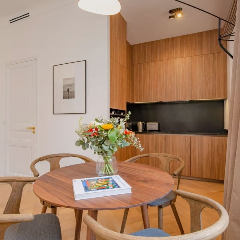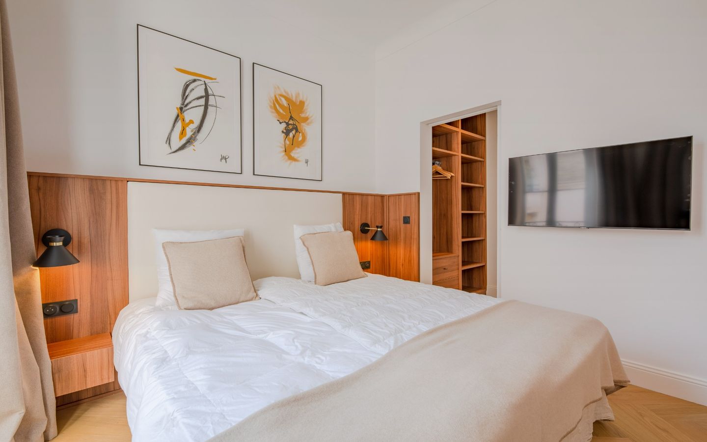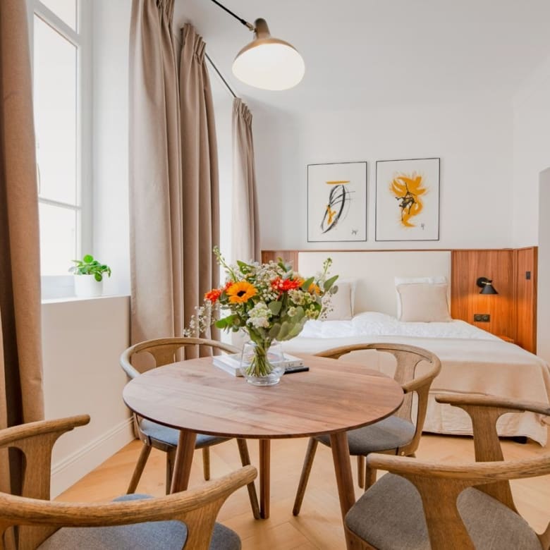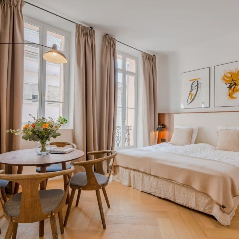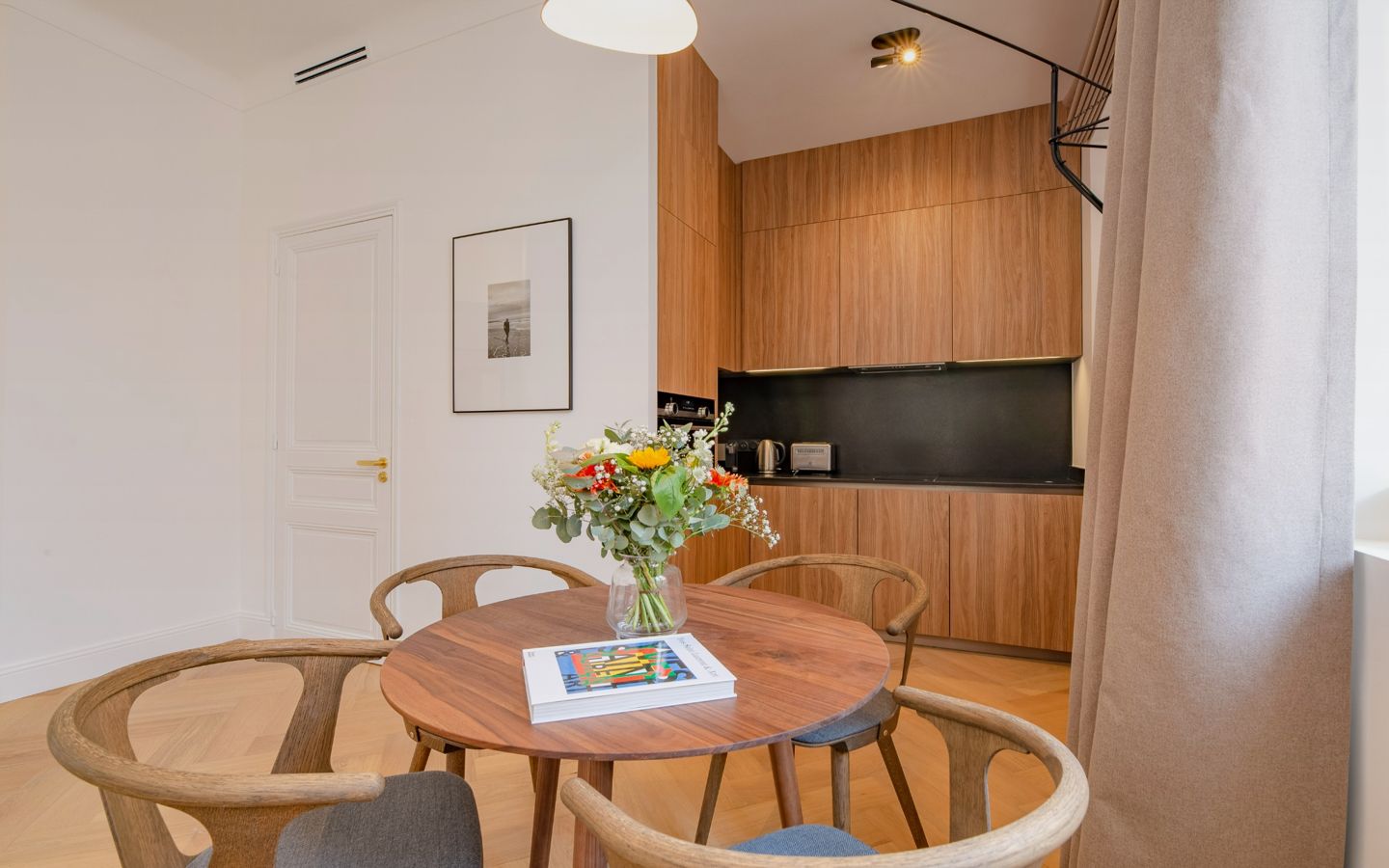 Renovated in 2024 by the acclaimed M-P Design, this luxury studio blends modern Scandinavian elegance with the feel of a 5-star boutique suite. High ceilings, large windows, walk-in closet and a clever layout make this 28 m² apartment feel spacious and functional – perfect for short-term rental guests.