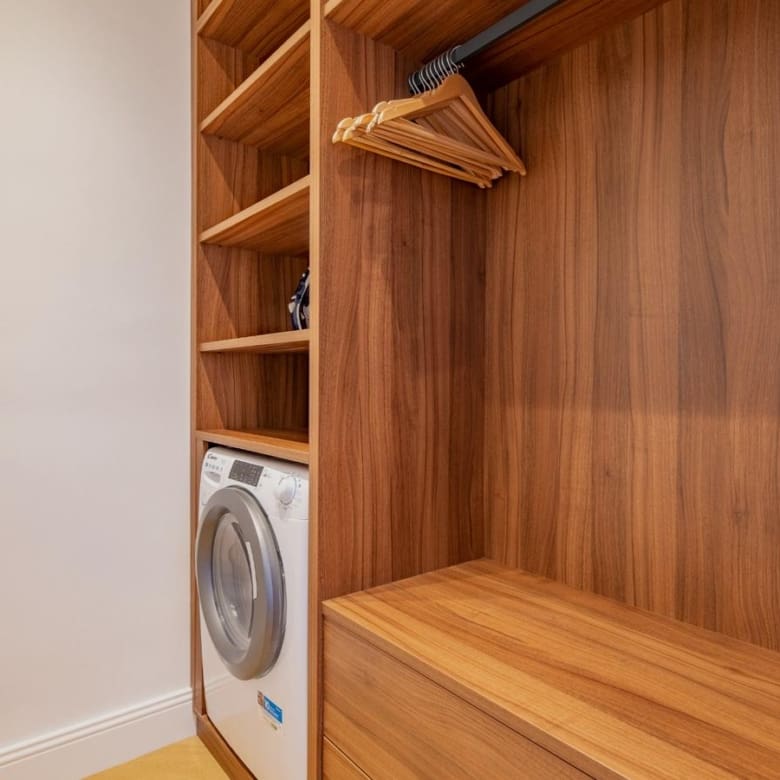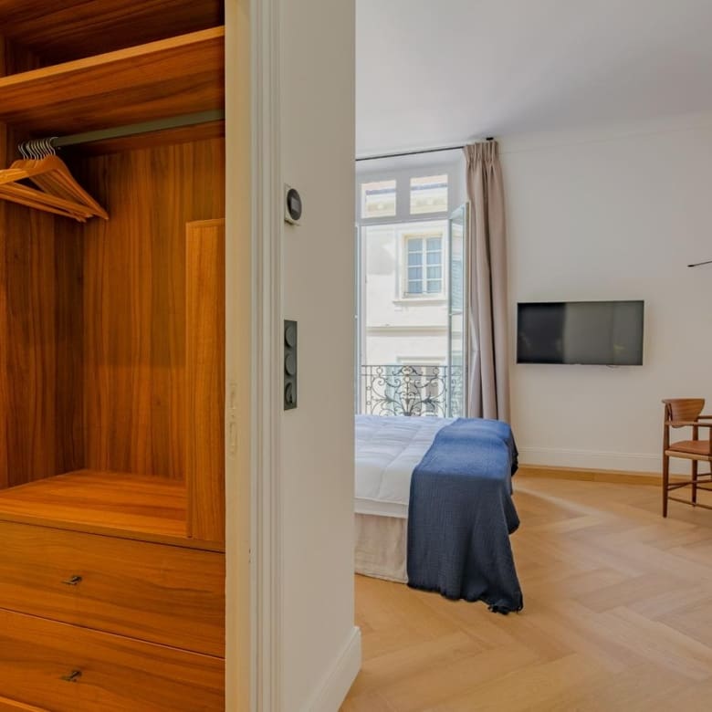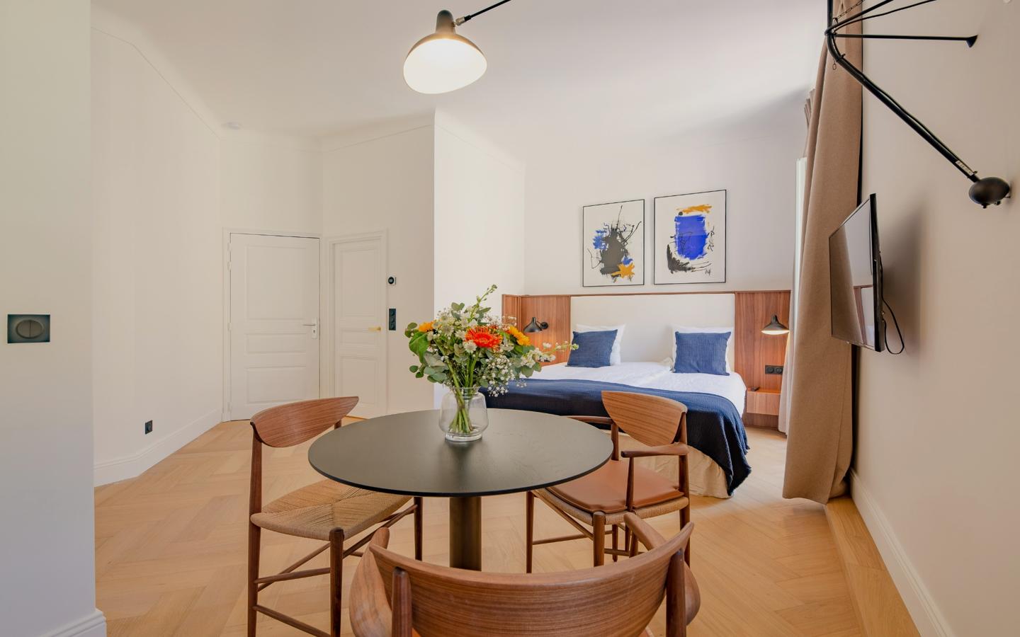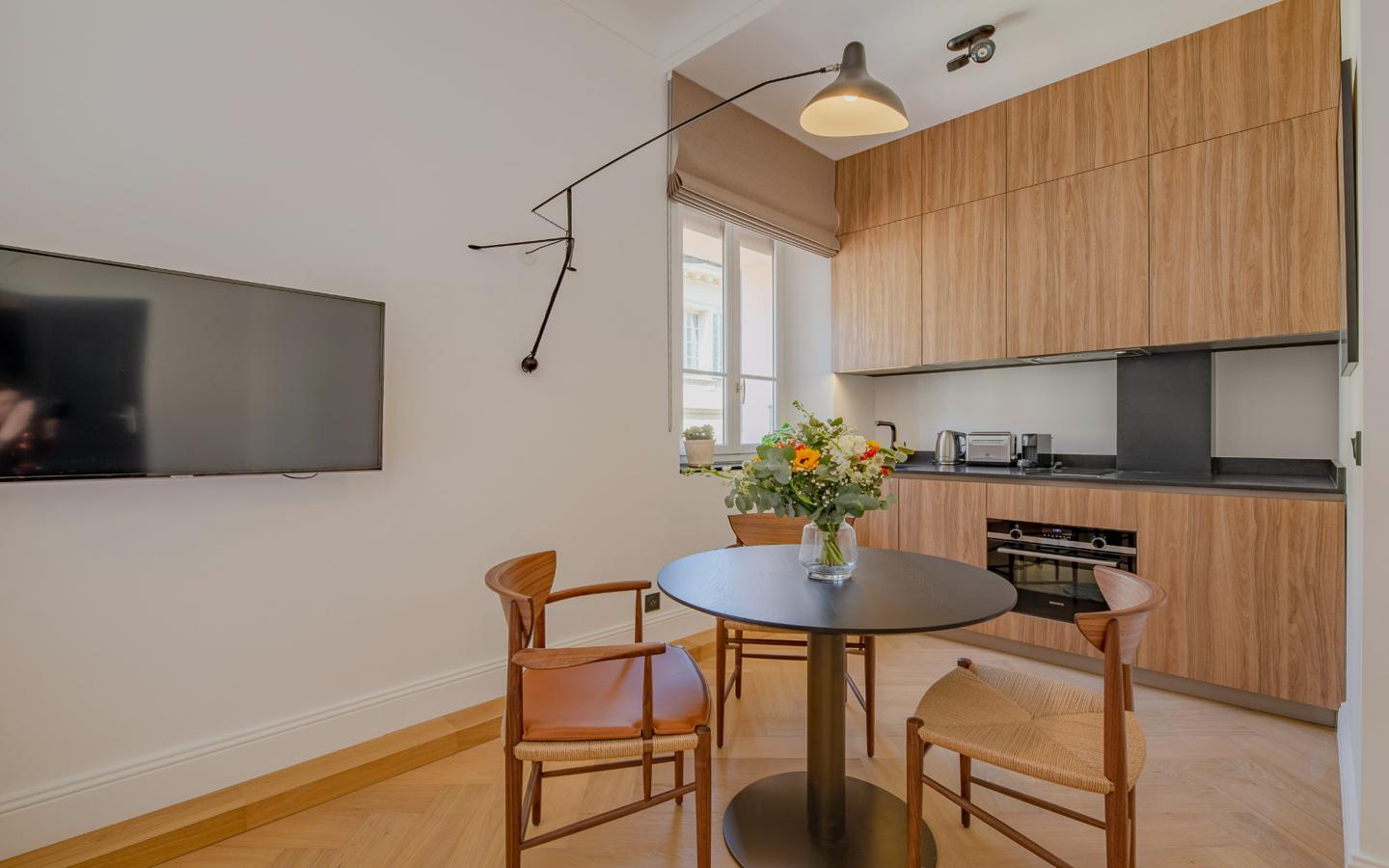 Renovated in 2024 by the acclaimed M-P Design, this luxury studio blends modern Scandinavian elegance with the feel of a 5-star boutique suite. High ceilings, large windows, walk-in closet and a clever layout make this 29 m² apartment feel spacious and functional – just perfect for short-term rental guests.